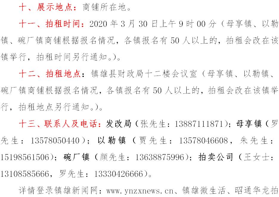 經(jīng)鎮(zhèn)雄縣人民政府批準(zhǔn),受相關(guān)部門(政府)委托,公開拍租位于鎮(zhèn)雄縣易地扶貧搬遷工程呢嚕坪安置點7棟獨立商鋪使用權(quán)、高山大地安置點27間(棟)商鋪使用權(quán)、魯家院子安置點24間(棟)商鋪使用權(quán)、母享安置點146間商鋪使用權(quán)、以勒物流城安置點67間(棟)商鋪使用權(quán)、碗廠安置點114間商鋪使用權(quán)。相關(guān)事項如下: