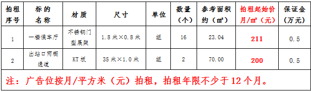 (四)拍租鎮(zhèn)雄縣開元商業(yè)物業(yè)服務有限公司以勒高鐵站站前廣場各類廣告位使用權(quán),詳見下表: